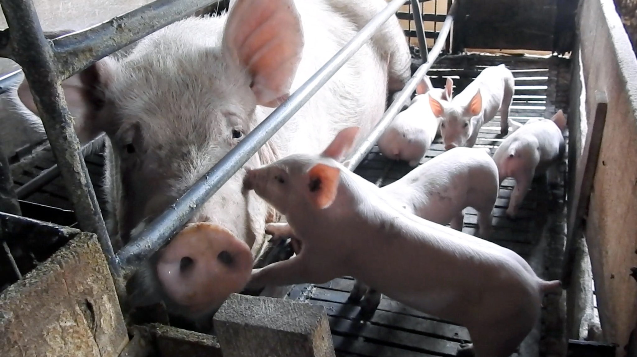 - Trabajadores encadenando de las piernas a los cerdos que chillan, elevándolos boca abajo y luego degollándolos.